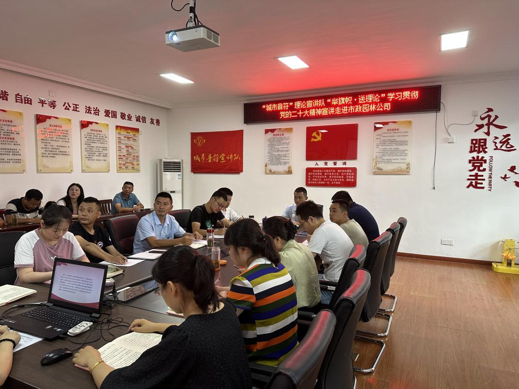 為深入學(xué)習(xí)宣傳貫徹黨的二十大精神,不斷推動(dòng)黨的創(chuàng)新理論走深走實(shí),提高黨員思想認(rèn)識(shí),增強(qiáng)黨員政治修養(yǎng),7月22日上午,黃山建投集團(tuán)“城市音符”理論宣講隊(duì)“舉旗幟·送理論”學(xué)習(xí)貫徹黨的二十大精神宣講走進(jìn)市政園林公司。