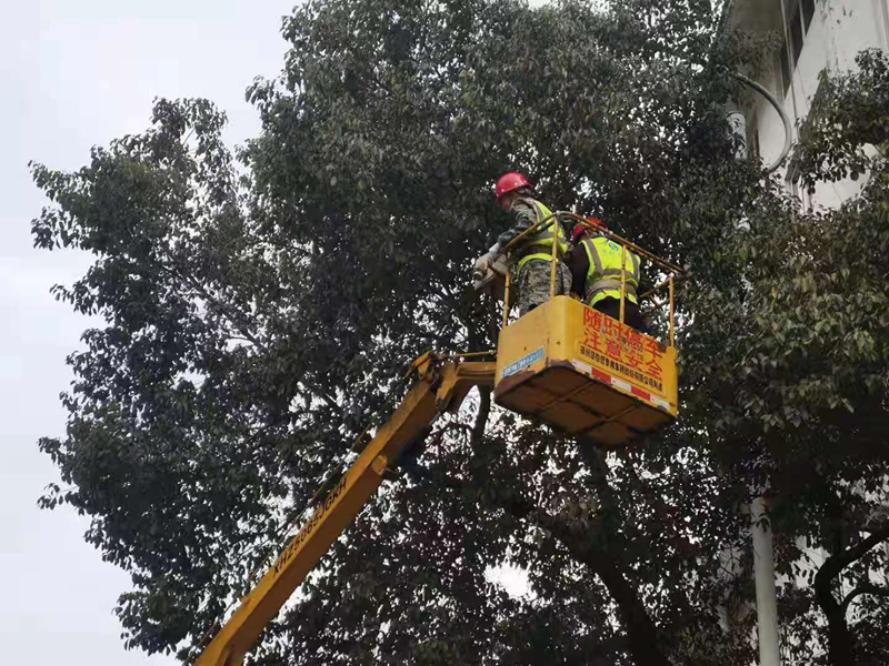 市中心延安路兩側的行道樹經過一年的生長枝葉茂盛,沿街部分路燈被樹枝遮攔。為了保障路燈夜間照明效果和市民出行安全,近日,市政園林公司組織人員對行道樹進行了修剪。