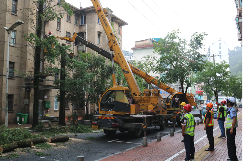 6月28日上午,公司組織了人員及高空作業(yè)車輛進場作業(yè),由于大雨天氣,作業(yè)難度較高,現(xiàn)場管理人員在擺放好現(xiàn)場安全設施后詳細交代了安全作業(yè)步驟,將作業(yè)人員分成二組進行工作,一組人員在吊車的配合下佩戴安全繩將修剪部分分段截下,一組人員在空曠位置分解截下的樹枝并全部裝車及時清運,整個工作任務是將17棵約20米的水杉重修剪至8米左右,并剔除死枝枯枝及靠近居民樓的危枝。