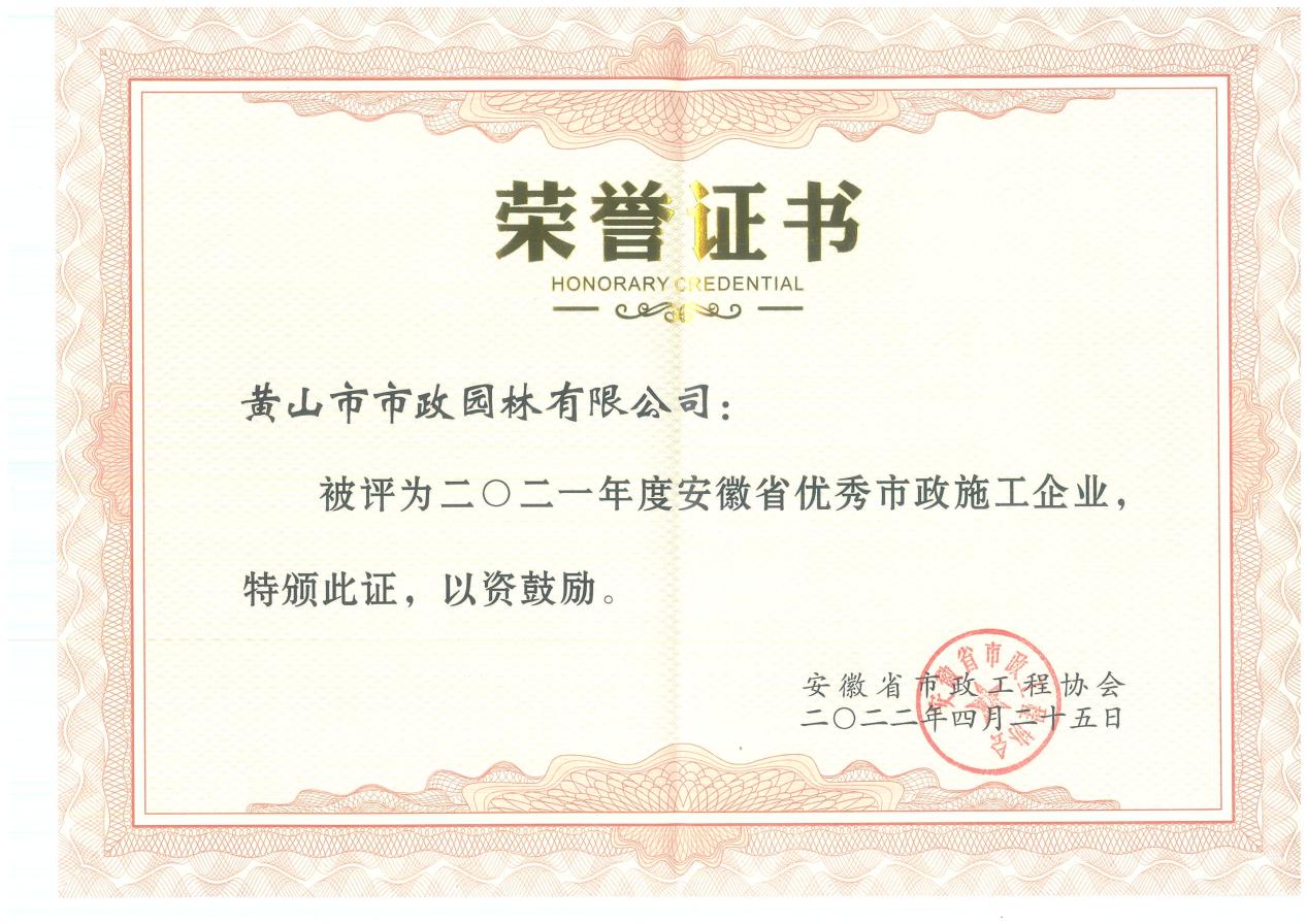 近日,黃山市市政園林有限公司被安徽省市政工程協(xié)會(huì)授予“2021年度安徽省優(yōu)秀市政施工企業(yè)”稱號(hào),這是公司獲評(píng)“2021年度黃山市優(yōu)秀建筑企業(yè)”“黃山市安全生產(chǎn)標(biāo)準(zhǔn)化示范工地”“市優(yōu)質(zhì)工程迎客松杯”等稱號(hào)后,獲得的又一重要榮譽(yù)。